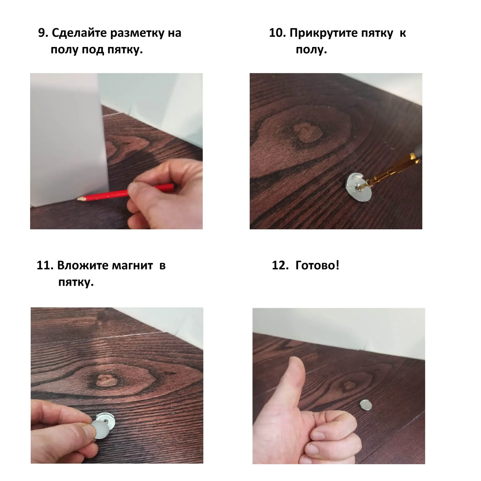 Стопор совместим с тёплыми полами - ответная часть с магнитом прикручивается к полу на шуруп длиной 12 мм. Тёплые полы не повредятся. Можно применять на любых половых покрытиях. При необходимости стопор можно легко отключить.Если у вас появится необходимость отключить стопор на время, это легко сделать. Просто снимите магнит с ответной части. Максимальное расстояние между дверным полотном и полом для правильной работы стопора составляет 12 мм. Вес дверного полотна до 40 кг.